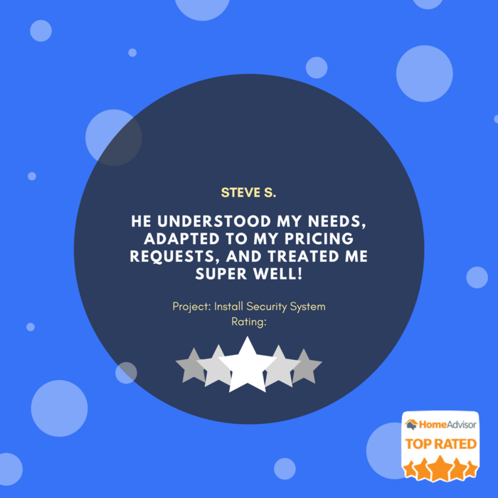 "I contacted First Florida Security because I was interested in purchasing a 24/7 continuous recording exterior camera system. From the initial walk-through assessment to installation and follow up, I was impressed with Eve and Todd’s knowledge of surveillance systems and monitoring strategies, as well as the top notch job they did in setting up a security system tailored to my specific needs. Another big plus was their pricing. After comparing it to several other companies I found it to be very competitive and reasonable. Overall, I’m very satisfied with this company. Pam S."